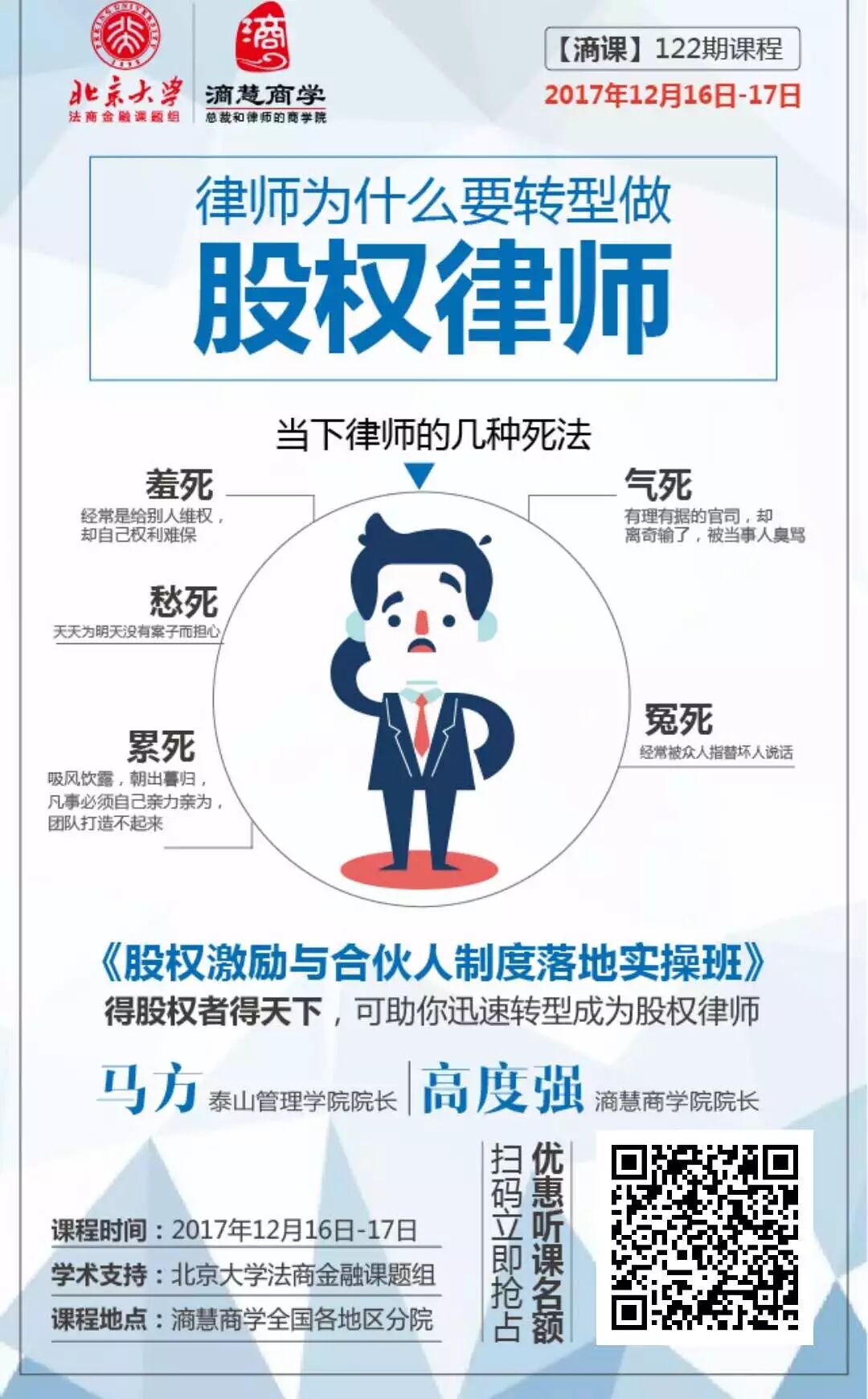 12月16-17日,国内知名股权激励专家马方老师,将为律师朋友们量身定制《股权激励与合伙人制度落地实操班》课程。课程包含股权激励的逻辑、员工持股如何设计、律师如何通过股权开拓企业市场、基于增量的干货激励、合伙人制度的设计、众筹项目股权设计等目前企业市场较为热门的业务,欢迎报名参加。